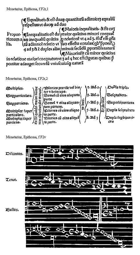 [De proportione tripla in marg.] Tripla. harmonice consideratur: quando tres figure equiualent vni: sibi ipsis. et nomine et quantitate consimili ita vt vnaqueque ipsarum trium diminuatur de duabus tercijs partibus proprie quantitatis. et figuratur hoc modo vt in concentu sequenti conspicitur [369/123, in marg.]