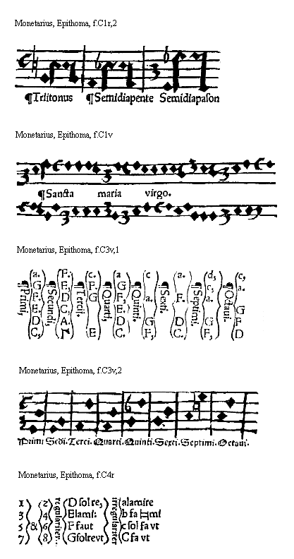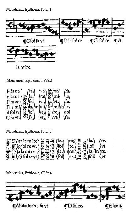 [Monetarius, Epitoma, f.B1v,2; text: vel signate et sunt hec quinque. ddlasol, g sol reut, csolfaut, Ffaut, [Gamma]ut, et figurantur hoc modo. In cantu meusurali hoc modo]
