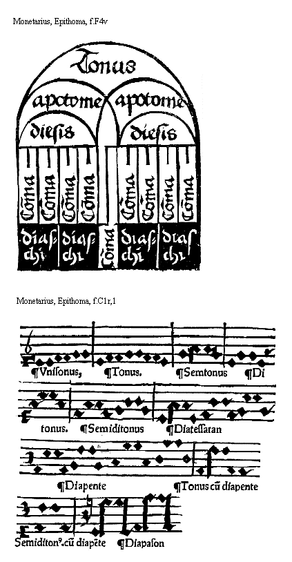Sunt et alia interualla minus vulgata: que rarissime vel nunquam inseruntur canticis: quarum nomina sunt: tritonus semidiapente semidiapasan. Semidiapente est saltus ab vna in quando tam prosiliens disparibus vocibus duos tonos duoque semitonia concludens: Semidiapason est saltus ab vna nam in sibi similem dispari vocum quantitate quatuor tonos triaque semitonia concludens istis vtraque septima adiungitur scilicet ditonus cum diapente et semiditouus cum diapente Tritonus est distantia vnius in quartam tribus immediate tonis colecta