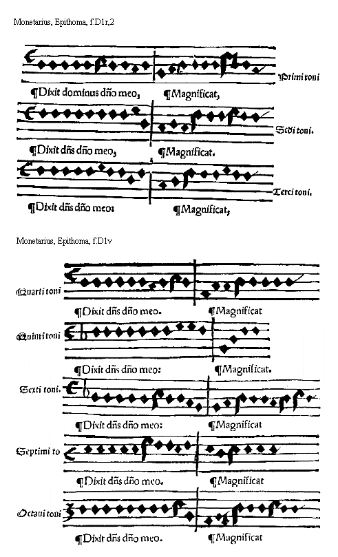 [Monetarius, Epitoma, f.D1r,2; text: Primi toni, Secundi, Terci, Dixit dominus domino meo, Magnificat]