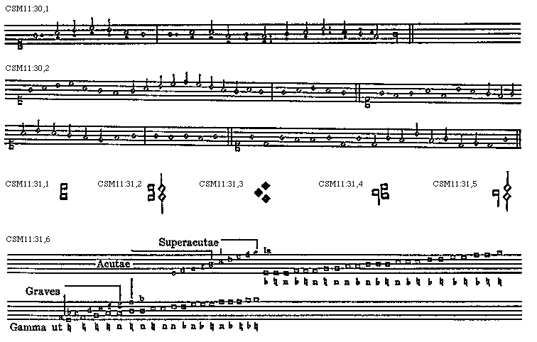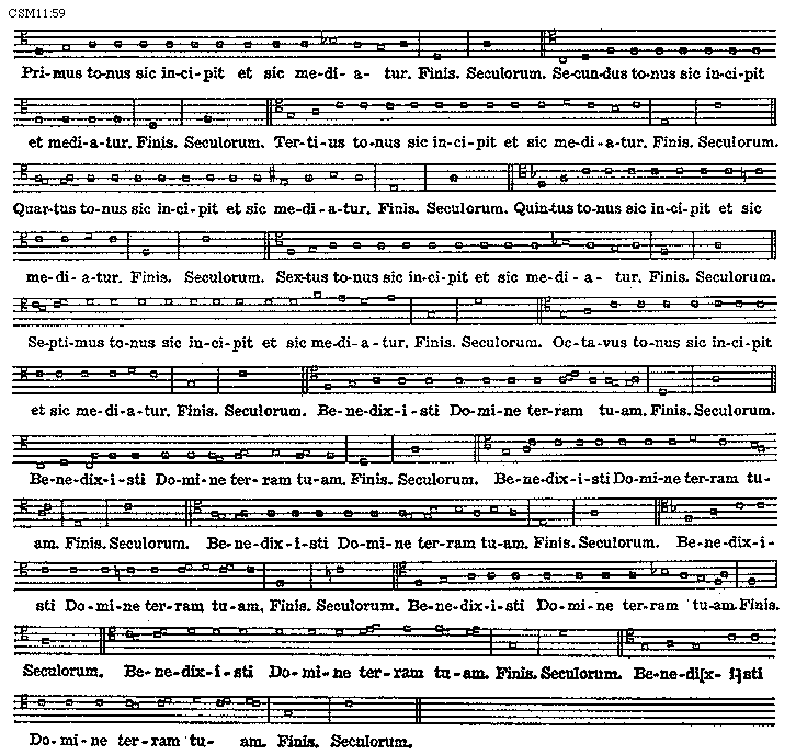 [CSM11:59; text: Primus tonus sic incipit et sic mediatur. Finis. Seculorum. Secundus tonus sic incipit et mediatur. Tertius tonus sic incipit et sic mediatur. Quartus tonus sic incipit et sic mediatur. Quintus tonus sic incipit et sic mediatur. Sextus tonus sic incipit et sic mediatur. Septimus tonus sic incipit et sic mediatur. Octavus tonus sic incipit et sic mediatur. Benedixisti Domine terram tuam. Benedixisti Domine terram tuam.]