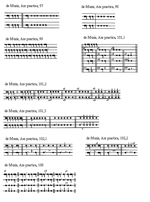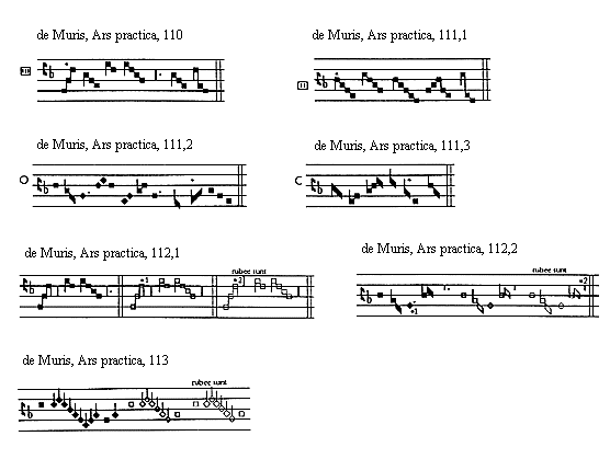 Source:Ars practica mensurabilis cantus secundum Iohannem de Muris: Die Recensio maior des sogenannten "Libellus practice cantus mensurabilis," ed. Christian Berktold, Bayerische Akademie der Wissenschaften, Veröffentlichungen der Musikhistorischen Kommission, Band 14 (Munich: Bayerische Akademie der Wissenschaften / C. H. Beck, 1999), 97–121.