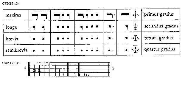 [134][CSM17:134; text: maxima, primus gradus, longa, secundus gradus, brevis, tertius gradus, semibrevis, quartus gradus]