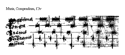 [Muris, Compendium, f.3v; text: Figure, Maxima, Longa Breuis, Semibreuis, Minima.]