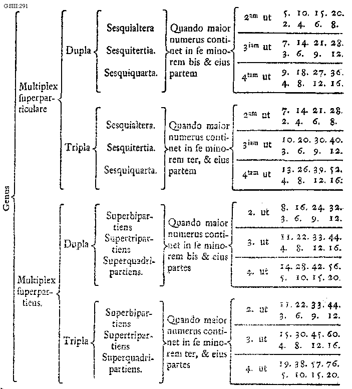 [GSIII:291; text: Genus, Multiplex superparticulare, Multiplex superpartiens. Dupla, Tripla, Sesquialtera, Sesquitertia. Sesquiquarta. Superbipartiens, Supertripartiens, Superquadripartiens. Quando maior numerus continet in se minorem bis et eius partem, Quando maior numerus continet in se minorem ter, et eius partem, secundam ut, tertiam ut, quartam ut, 2. 3. 4. 5. 6. 7. 8. 9. 10. 11. 12. 13. 14. 15. 16. 18. 19. 20. 21. 22. 24. 26. 27. 28. 30. 32. 33. 36. 38. 39. 40. 42. 44. 45. 52. 56. 57. 60. 76.]