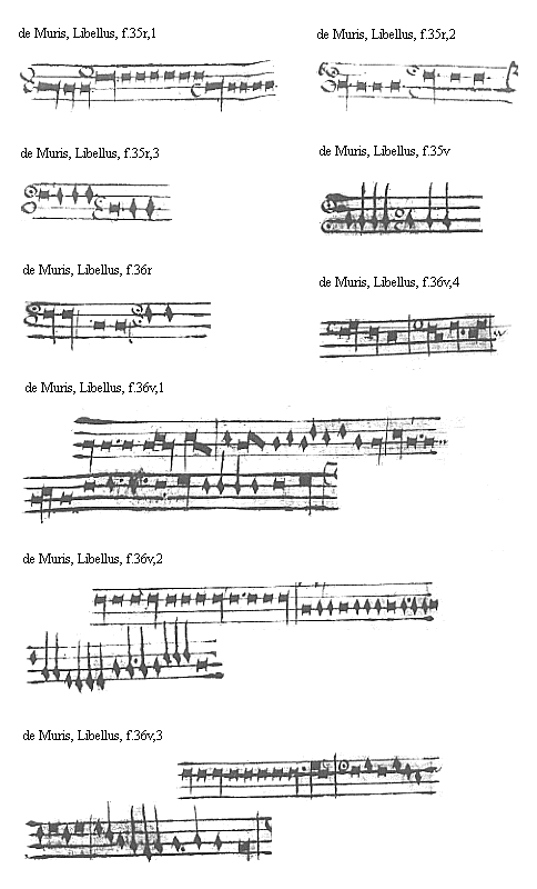 [f.36r]diuiditur. sicut maximarum. partes propinque sunt longe longarum. breues breuium. semibreues et cetera Partes remote. sunt partes parcium propinquarum. remociores partes. parcium. parcium propinquarum et cetera [Nota m.sec. in marg.] Maxima igitur quo ad partes propinquas potest inperfici dupliciter scilicet a parte ante et a parte post per abstraccionem tercie partis valoris cuiuslibet partis propinque vel alterius earundem et sic similiter quo ad partes earundem remotas per abstraccionem tercie partis de valore cuiuslibet partis remote. vel alterius earundem et cetera et sic isto modo intelligi potest de .longis. breuibus. et semibreuibus exempla inferius et econuerso Et pro predictis et infrascriptis nota has regulas