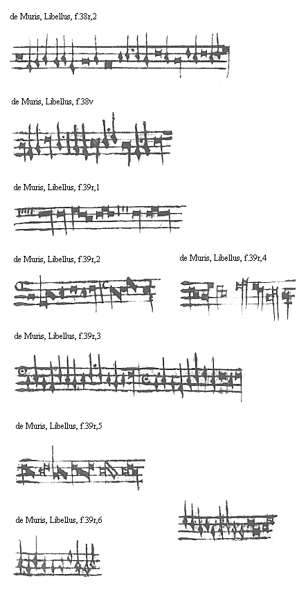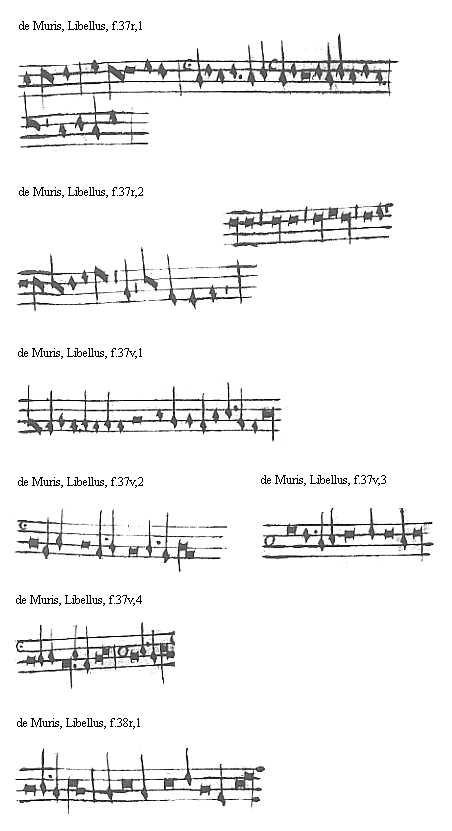 [f.38v]longam inperfectam de duabus breuibus et sex semibrebreuibus et maximam inperfectam de duabus longis et sex breuibus Ac sicut est dare breuem perfectam valentem tres semibreues valentes nouem minimas Ita et longa de tribus breuibus et nouem semibreuibus et maximam de tribus longis et nouem breuibus Ex predictis sufficienter colligitur inperfeccio longarum et maximarum patet eciam ex exemplis sequentibus et primo de longis inperfectis modo et tempore sed maioris prolacionis ut hic