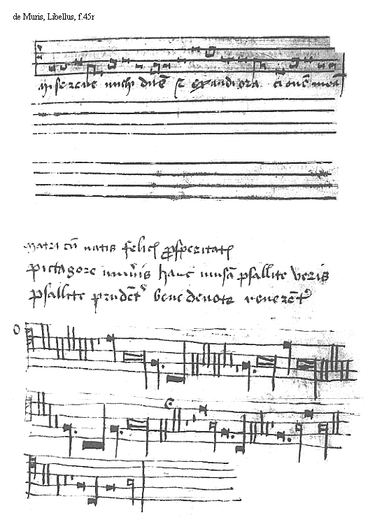 [f.45r][de Muris, Libellus, f.45r; text: miserere michi domine et exaudi oracionem meam, matri cum natis felicis prosperitatis, pictagore numeris hanc musam psallite veris, psallite prudenter bene deuote reuerenter m.sec.]