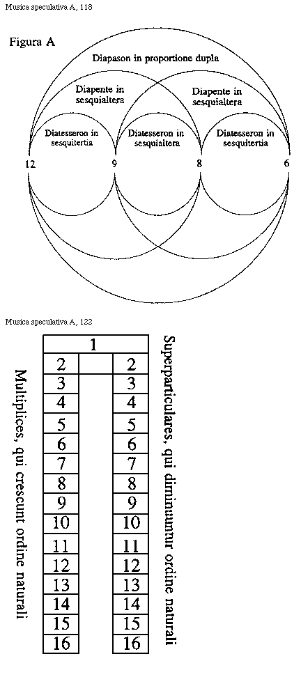 [210]Nam diapason in dupla, diapente in sesquialtera formatur. Sed proportio dupla et sesquialtera iuncta formant triplam proportionem per quintam, quod patet in numeris: 1 et 2 duplam reddunt proportionem, scilicet diapason, 2 et 3 sesquialteram, scilicet diapente, sed 3 ad 1 triplam, quare diapason cum diapente iuncta triplam faciunt proportionem.