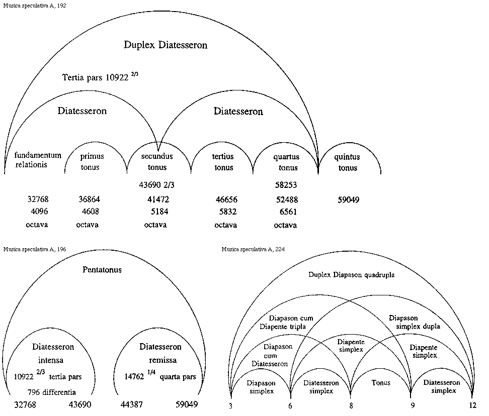 [216]In hoc autem tamquam inconvenienti Pythagorici quieverunt. Ex quo videtur intentio eorum, quod diatesseron intensa, super quam intenditur diapente, non sit consonantia, sicut, cum diapente intensa supra diatesseron intendatur, licet utrobique sit diapason in extremis.