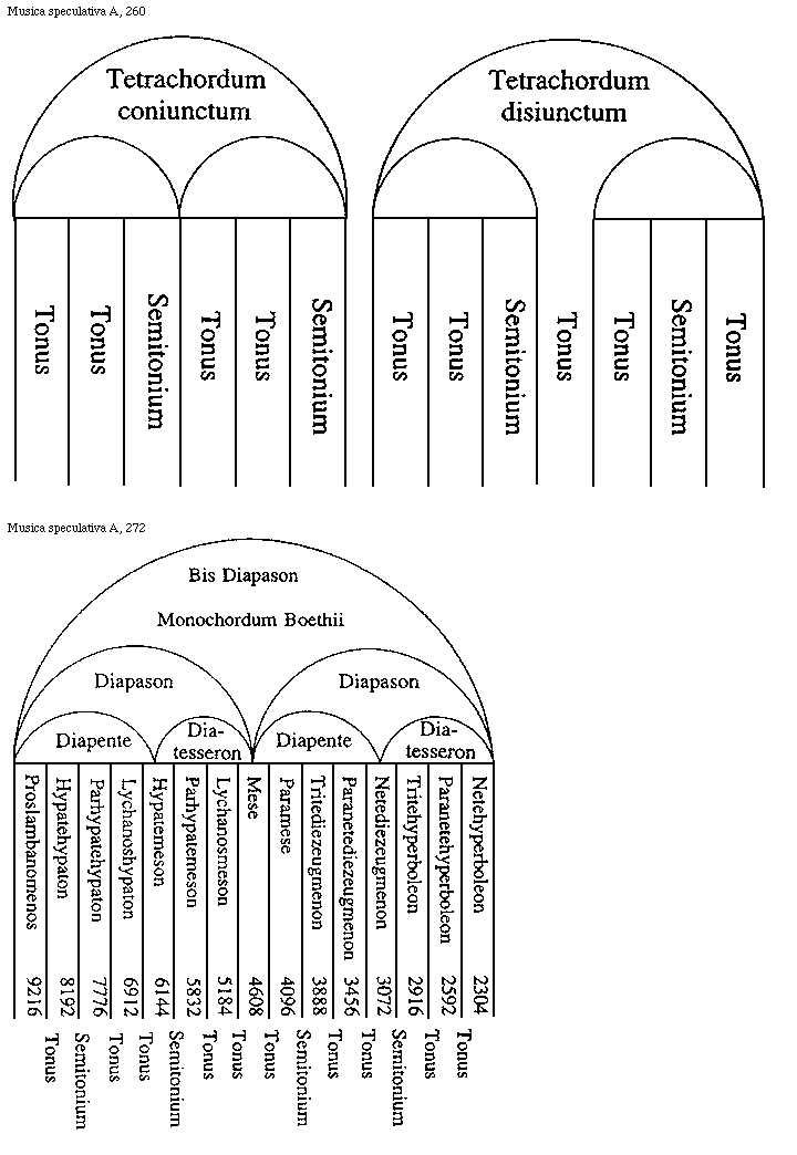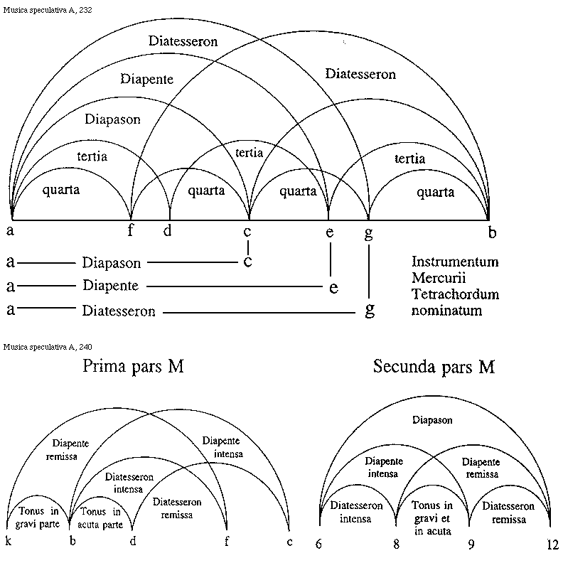 [254]musici tam antiqui quam novi primum tetrachordum diatesseron esse concesserunt, quoniam quilibet tonus duas chordas requirit et similiter semitonium duas; modo, cum in diatesseron sint duo toni cum semitonio, manifestum est quatuor chordas diatesseron continere. Quaelibet autem chorda servit pro fine unius toni et initio alterius praeter primam et ultimam.