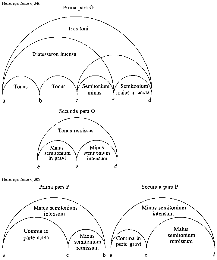 [250][Musica speculativa A, 250; text: Prima pars P, Secunda pars P, Maius semitonium intensum, Minus semitonium intensum, Comma in parte acuta, Minus semitonium remissum, Comma in parte gravi, Maius semitonium remissum, a, c, b, e, d]