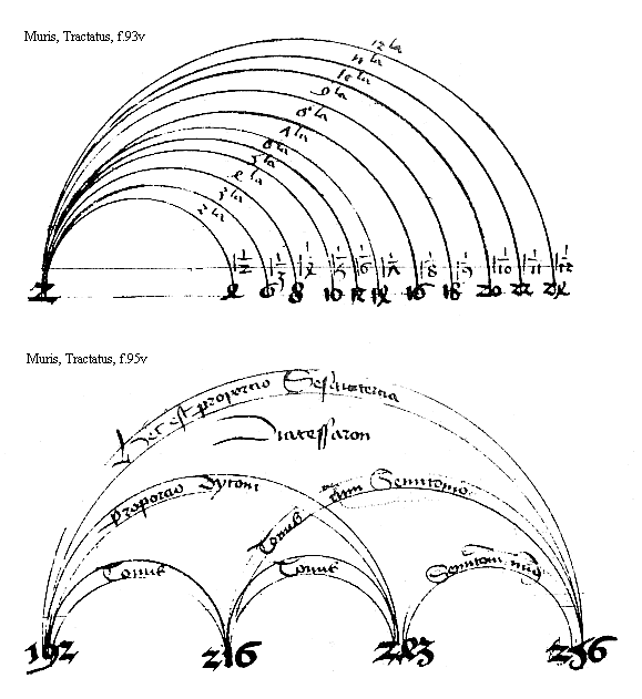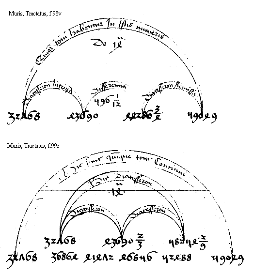 [Muris, Tractatus, f.91v; text: diapason consonancia in proporcione dupla, diapenthe in proporcione sesqualtera, diatesseron in sesquitercia, tonus in proporcione sesquioctaua, diatesseron epitriti, 6, 8, 9, 12]