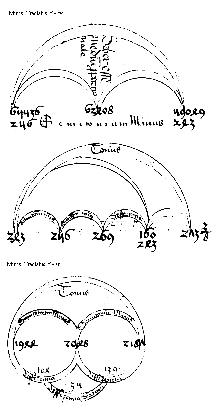 [f.96v]vt 2 et 3 in sesqualtera proporcione se habent Ex hijs autem procreati sunt 469 inter quos eciam eadem proporcio Inuenitur Ducatur enim et tercia velut radices infra in se quam in alterum supradicto numeros generabunt Ex hoc sit numerum 243 et 256 Inter quos est proporcio semitonialis Ducantur ut radices tam in se quam vnus in alteram et producentur hij numeri 59049. 62408. 65536. Inter quos similiter proporcio semitonialis inuenitur Si igitur inter radices sint vere semitonii proporcio cum illa sit in numeris propositus duplicata sequetur quod inter extrema toni sit proporcio quod est falsum Nam si super primum sui octaua pars addatur tercia superabit Igitur inter primum et secundum non fuit vere semitonium Nec inter secundum et tercium Igitur primum et tercium tonum complere nequierunt Igitur similiter inter 2 radices que sunt 243 et 256 non fuit vera toni medietas ymo minus quod est propositum declaratum sicut presentes figure subscripte describunt