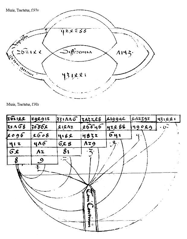 [Muris, Tractatus, f.97v; text: Diapason, Sex toni continui, Differencia, 262144, 524288, 531441, 7153]