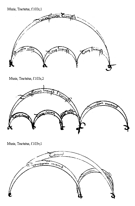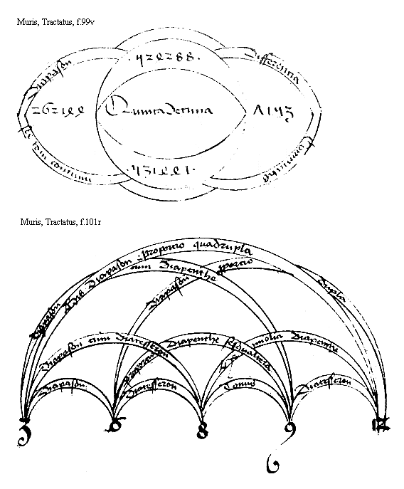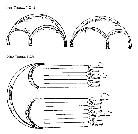 [Muris, Tractatus, f.103r,2; text: Diatesseron intensa vel remissa, Semitonium maius, Semitonium minus, Tonus acutus, a, b, c, d, f]