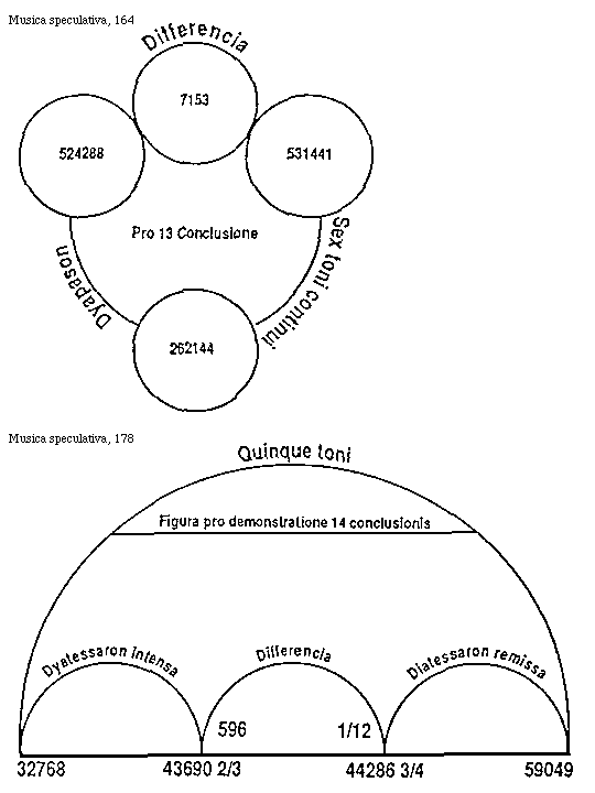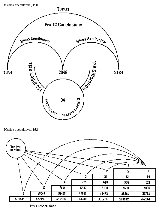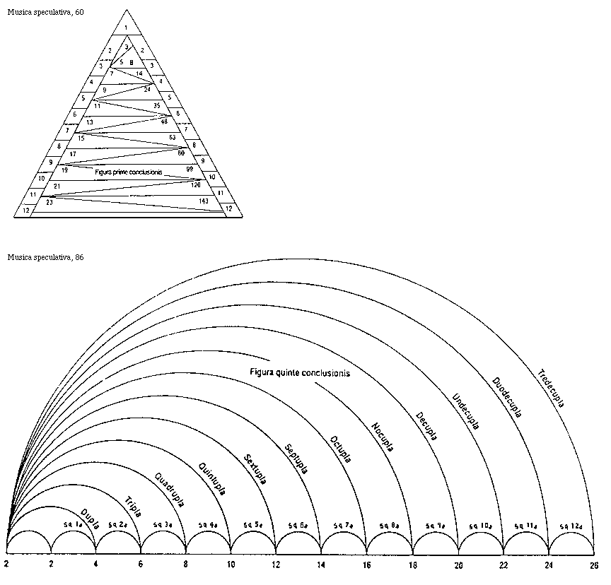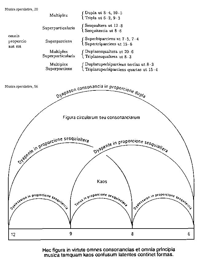 [12]Omnis autem paucitas ad pluralitatem sub quodam numero refertur, ergo sonum gravem ad acutum comparando necessarium est referri, sicut numerus motuum unius ad numerum motuum alterius proporcionaliter comparatur. Cum ostensum sit musicam constare ex sonis, qui sunt proporcionales ad invicem quodamodo secundum numeros motuum in eis repertos, non est inutile percurrere proporciones generales numerorum.