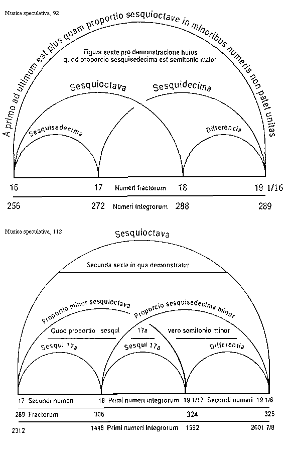[254]Breviter, si dyatessaron et dyapenthe seorsum intendantur ut 6.8, 6.9, inventus est tonus in acuta parte. Sique ambe in eodem termino remittantur, inventus est tonus in gravi parte ut 12.8, 12.9; et hoc est intelligendum quantum ad quantitatem discretam non autem continuam, et sic est iste modus contrarius precedenti, sed in idem reddit.
