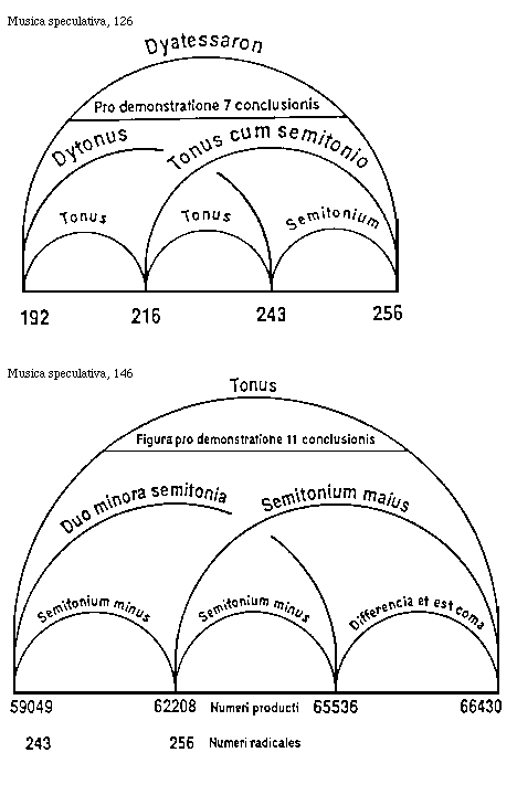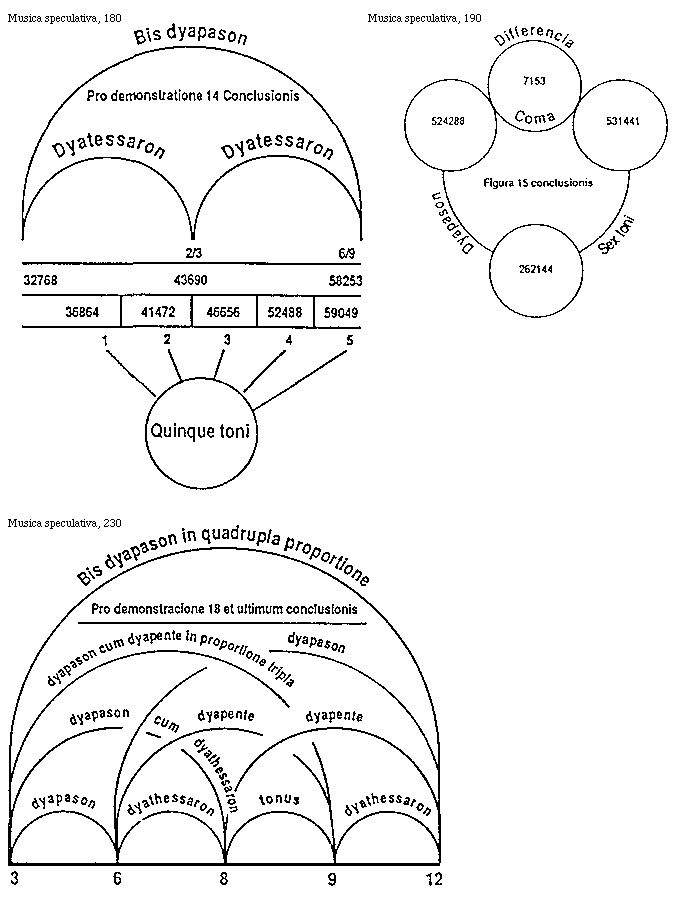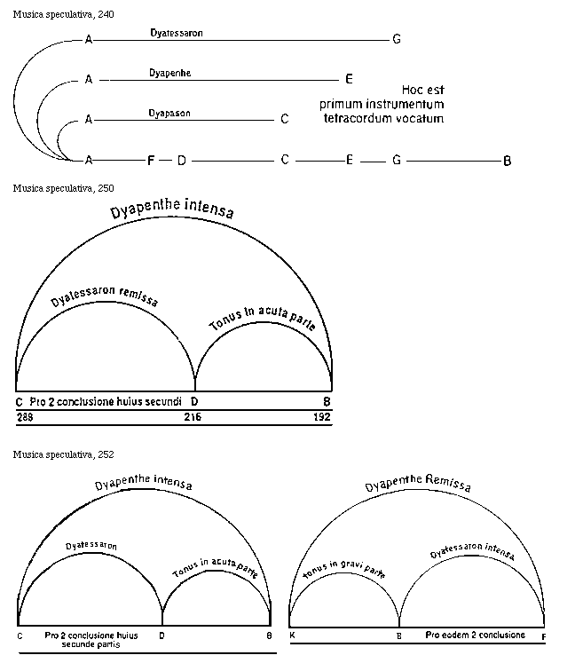 [Musica speculativa, 250; text: Dyapenthe intensa, Dyatessaron remissa, Tonus in acuta parte, C, D, B, Pro secunda conclusione huius secundi, 288, 216, 192]