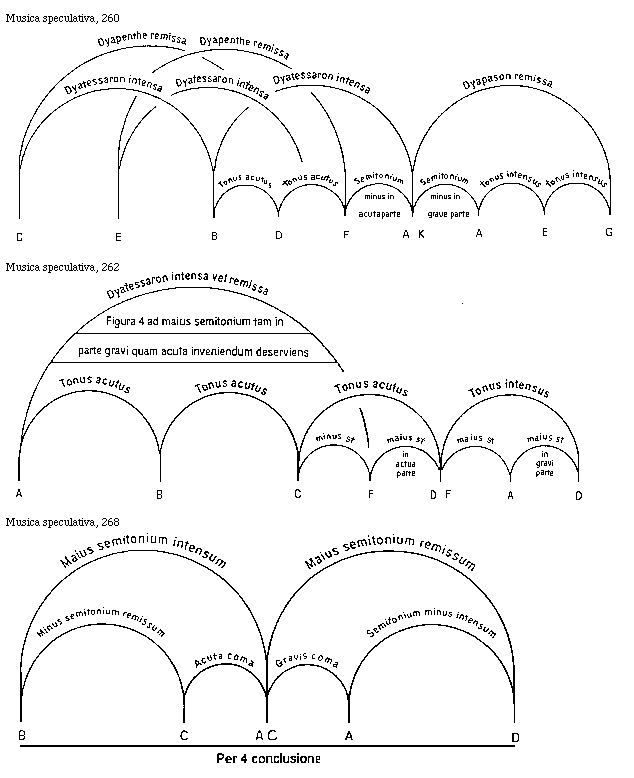 [Musica speculativa, 268; text: Maius semitonium intensum, Maius semitonium remissum, Minus semitonium remissum, Semitonium minus intensum, Acuta coma, Gravis coma, B, C, A, D, Per quarta conclusione]