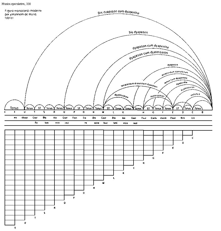 [304]Quocumque autem modo fiat, nunquam proporcio variatur. Sed tamen primitus ego ponam divisionem monocordi dyatonici secundum Boecium, in quo non est nisi bis dyapason. Quantum ad proporcionem numerorum licet ei non repugnet ter vel quater dyapason.
