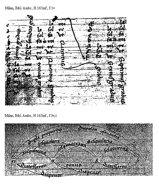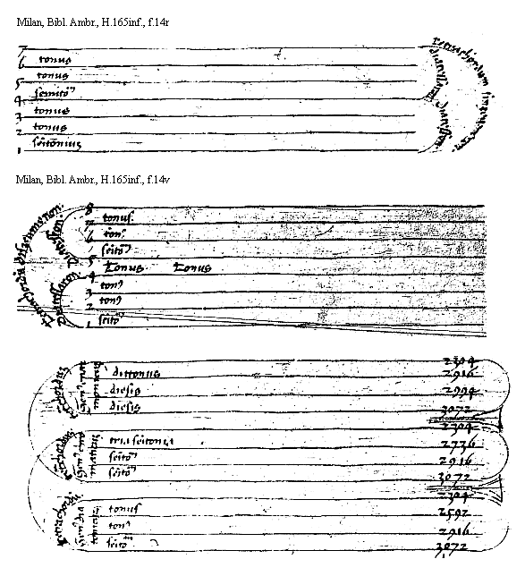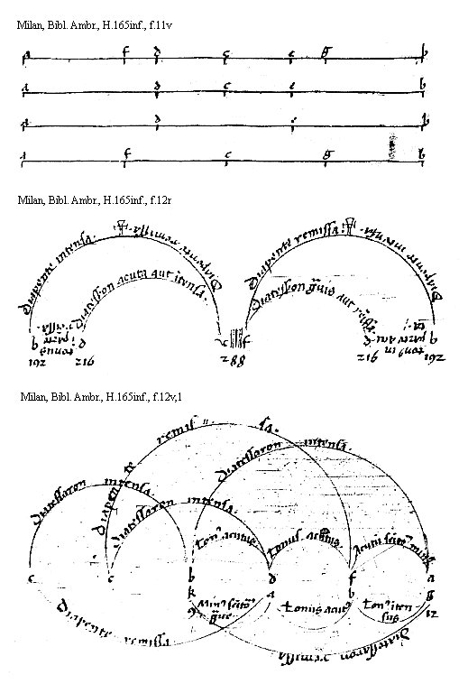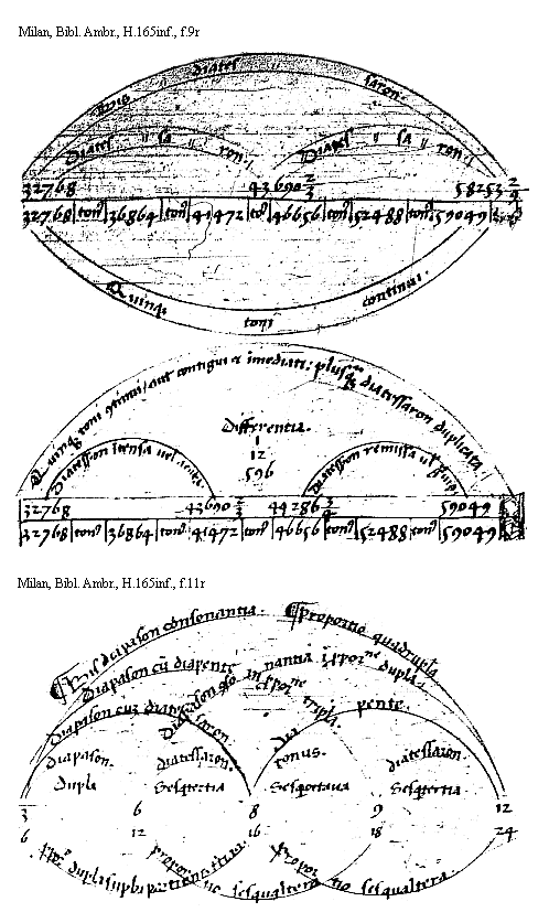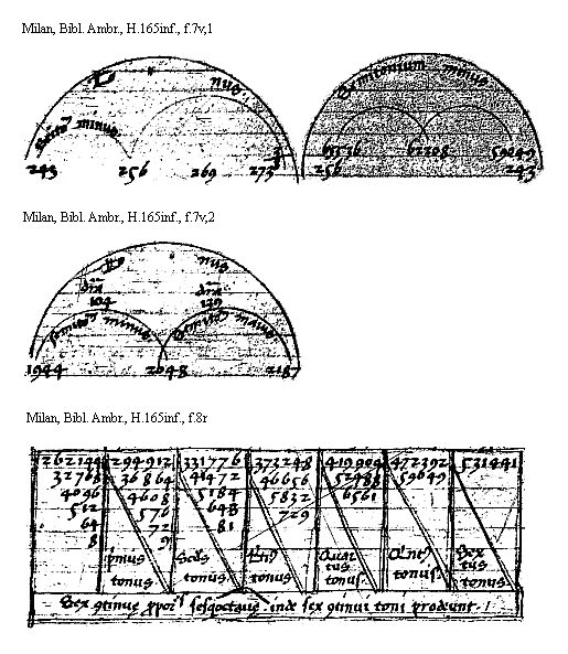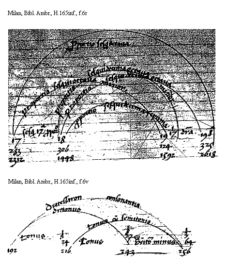 [Milan, Bibl. Ambr., H.165inf., f.12r; text: Diapente intensa, Diapente remissa, Diatessaron acuta aut intensa, Diapente grauis aut remissa, tonus in parte remissa, tonus in parte acuta, b, d, c, f, 192, 216, 288]