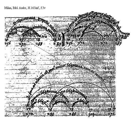 [Milan, Bibl. Ambr., H.165inf., f.5v; text: Sesquioctaua proportio maior, sesquioctaua proportio, differentia, sesquidecimasexta proportio, sesquidecimaseptima, 16, 17, 18, 18 1/16, 256, 272, 288, 289, De primo ad ultimum est proportio plusquam sesquioctaua numeri minoris, proportio sesquioctaua numeri integri, De primo ad ultimum est proportio minor sesquioctaua numeri maioris, sesquidecimaoctaua, 304]