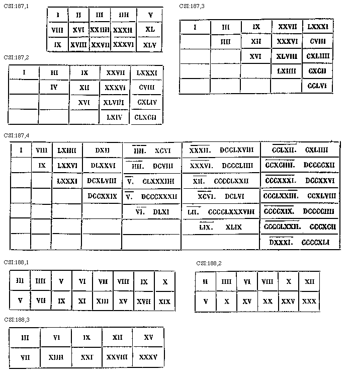 [CSI:187,4; text: I, VIII, LXIIII, DXII, IIII[macron supra lin.].XCVI, XXXII[macron supra lin.].DCCLXVIII, CCLXII[macron supra lin.].CXLIIII, IX, LXXVI, DLXXVI, IIII[macron supra lin.].DCVIII, XXXVI[macron supra lin.].DCCCLIIII, CCXCIIII[macron supra lin.].DCCCCXII, LXXXI, DCXLVIII, V[macron supra lin.].CLXXXIIII, XII[macron supra lin.].CCCCLXXII, CCCXXXI[macron supra lin.].DCCXXVI, DCCXXIX, V[macron supra lin.].DCCCXXXII, XCVI[macron supra lin.].DCLVI, CCCLXXIII[macron supra lin.].CCXLVIII, VI[macron supra lin.].DLXI, LII[macron supra lin.].CCCCLXXXVIII, CCCCXIX[macron supra lin.].DCCCCIIII, LIX[macron supra lin.].XLIX, CCCCLXXII[macron supra lin.].CCCXCII, DXXXI[macron supra lin.].CCCCXLI]