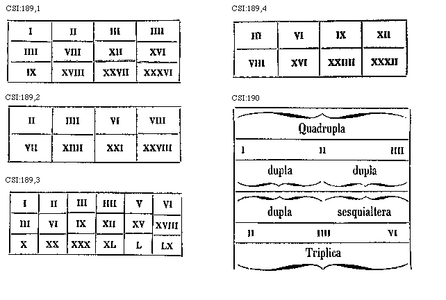 [CSI:190; text: Quadrupla I, II, IIII, dupla, sesquialtera, VI, Triplica]