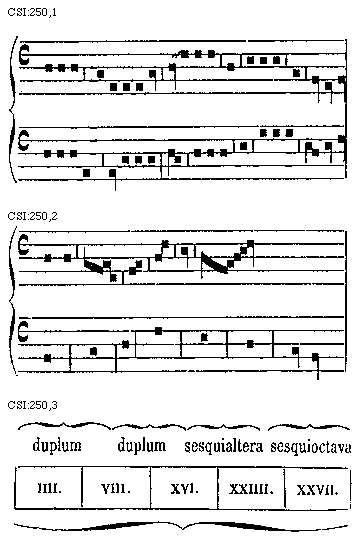 [CSI:250,3; text: duplum, sesquialtera, sesquioctava, IIII. VIII. XVI. XXIIII. XVII.]