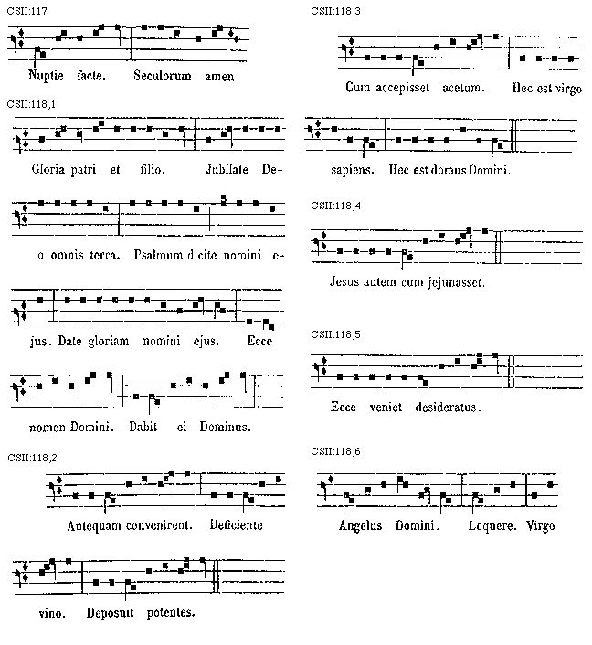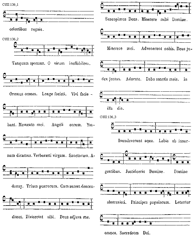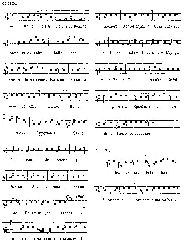 [138][CSII:138,1; text: Hodie celestis. Potens es Domine. Scriptum est enim. Hodie beata. Qui sunt hi sermones. Isti sunt. Amen amen dico vobis. Dicite. Hodie. Maria. Opportebat. Gloria. Magi. Domine. Jesu omnis. Ipse. Iterum. Stent in. Domine. Quoniam. Ponam in Syon. Inundare. Scriptum est enim. Dum ortus est. Dum medium. Fontes aquarum. Cum turba multa. Super solum. Dum sacrum. Martinus. Propter lignum. Misit rex incredulus. Nativitas gloriosa. Spiritus sanctus. Paraclitus. Paulus et Johannes.]