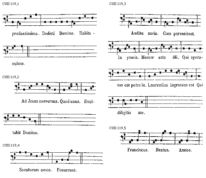 [CSII:119,3; text: Auditu auris. Cum pervenisset. In ymnis. Memor esto fili. Qui operatus est petro in. Laurentius ingressus est Qui diligitis me.]