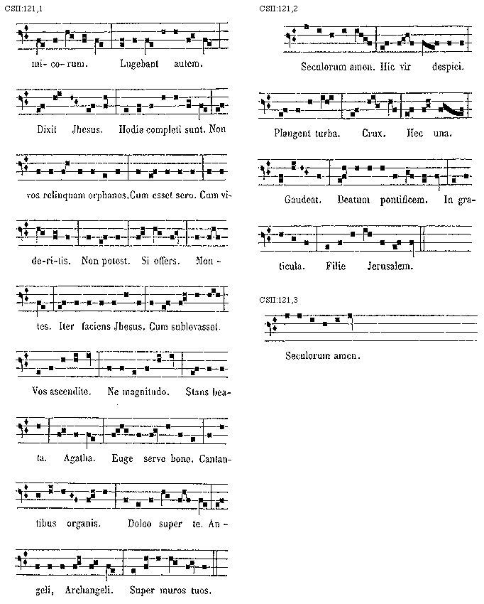 [121][CSII:121,1; text: Lugebant autem. Dixit Jhesus. Hodie completi sunt. Non vos relinquam orphanos. Cum esset sero. Cum videritis. Non potest. Si offers. Montes. Iter faciens Jhesus. Cum sublevasset. Vos ascendite. Ne magnitudo Stans beata. Agatha. Euge serve bone. Cantantibus organis. Doleo super te. Angeli Archangeli. Super muros tuos.]
