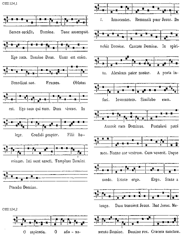 [124][CSII:124,1; text: Semem cecidit. Domine. Tunc assumpsit. Ego sum. Domine Deus. Unus est enim. Benedicat nos. Framea. Oblatus est. Ego sum qui sum. Dum vivens. In lege. Credidi propter. Filii hominum. Isti sunt sancti. Templum Domini. Placebo Domino.]