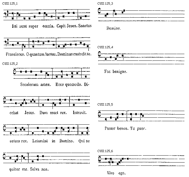[125][CSII:125,1; text: Isti sunt super omnia. Cepit Jesus. Sanctus Franciscus. O quantum luctus. Dominus custodit te.]