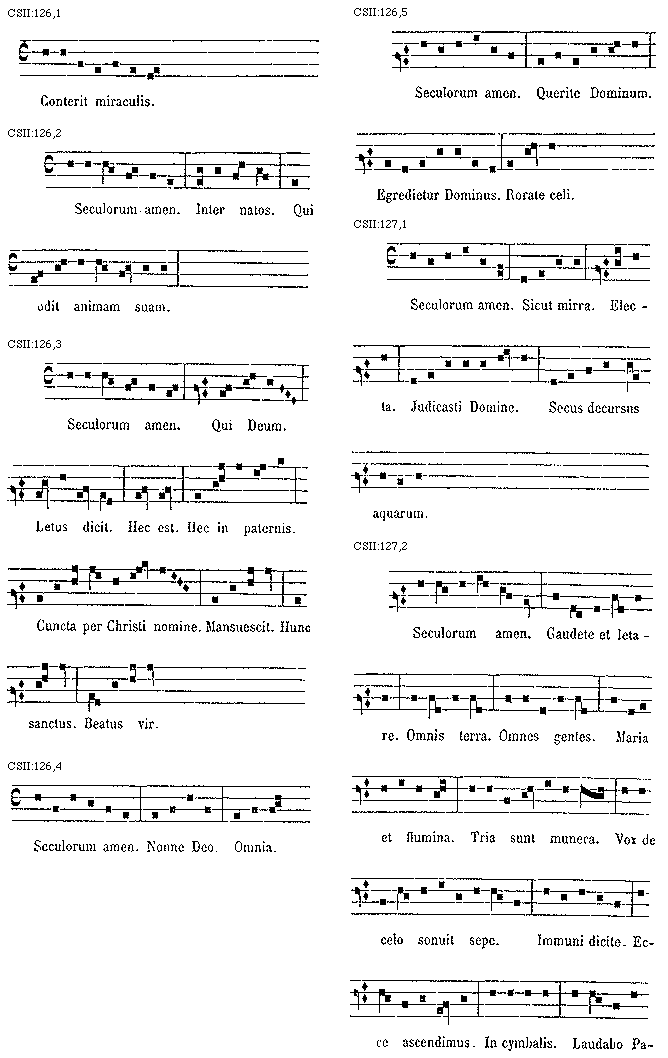 [CSII:127,2; text: Seculorum amen. Gaudete et letare. Omnis terra. Omnes gentes. Maria et flumina. Tria sunt munera. Vox de celo sonuit sepe. Immuni dicite. Ecce ascendimus. In cymbalis. Laudabo Pater]