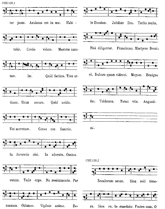 [128][CSII:128,1; text: juste. Anxiatus est in me. Habitabit. Credo videte. Mentem sanctam. Ite. Quid faciam. Tres ordines. Sicut sorore. Quid nobis. Est secretum. Grave cor. Sanctis. In ferventis olei. In adventu. Omnes autem. Tulit ergo. Ne reminiscaris. Per tractum. Oblatam. Vigilate animo. Dele Domine. Jubilate Deo. Turba multa. Nisi diligenter. Franciscus. Martyres Domini. Rubum quem viderat. Moyses. Benigne fac. Triduana. Totus vite. Augustini.]
