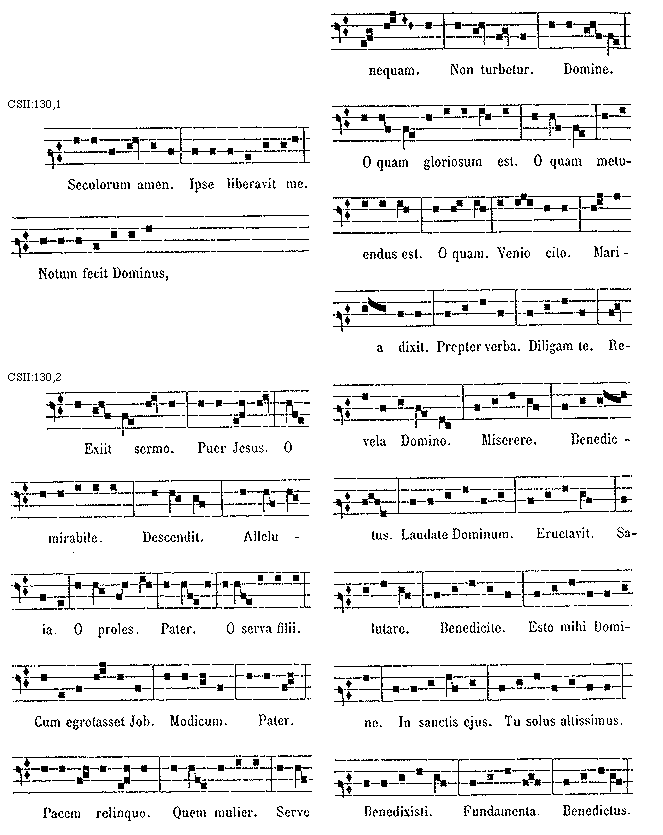 [CSII:130,2; text: Exiit sermo. Puer Jesus. O mirabile. Descendit. Alleluia. O proles. Pater. O serva filii. Cum egrotasset Job. Modicum. Pater. Pacem relinquo. Quem mulier. Serve nequam. Non turbetur. Domine. O quam gloriosum est. O quam metuendus est. O quam. Venio cito. Maria dixit. Propter verba. Diligam te. Revela Domino. Miserere. Benedictus. Laudate Dominum. Eructavit. Salutare. Benedicite. Esto mihi Domine. In sanctis ejus. Tu solus altissimus. Benedixisti. Fundamenta. Benedictus.]