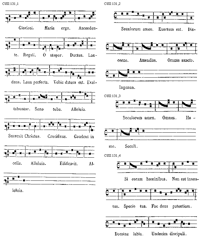 [131][CSII:131,1; text: Gloriosi. Maria ergo. Ascendente. Regali. O stupor. Ductus. Laudans. Laus perfecta. Vobis datum est. Exaltabuntur. Sono tube. Alleluia. Surrexit Christus. Crucifixus. Gaudent in celis. Edificavit.]