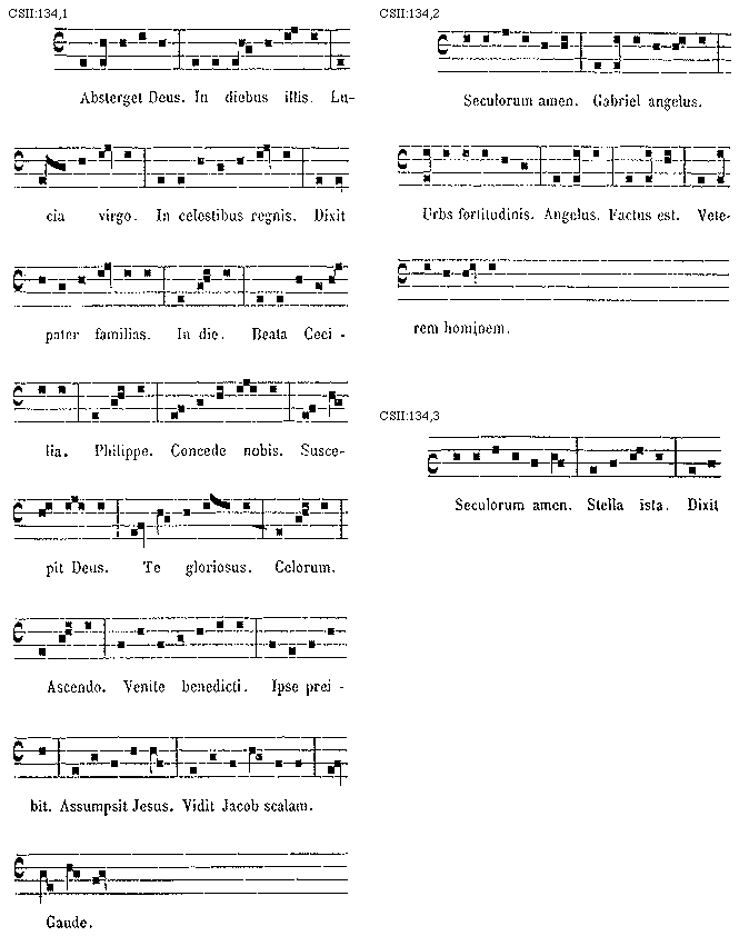 [134][CSII:134,1; text: Absterget Deus. In diebus illis. Lucia virgo. In celestibus regnis. Dixit pater familias. In die. Beata Cecilia. Philippe. Concede nobis. Suscepit Deus. Te gloriosus. Celorum. Ascendo. Venite benedicti. Ipse preibit. Assumpsit Jesus. Vidit Jacob scalam. Gaude.]
