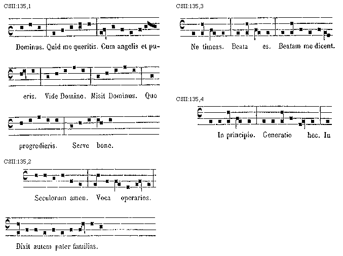 [CSII:138,2; text: Rex pacificus. Peto Domine. Mercenarius. Propter nimium caritatem.]