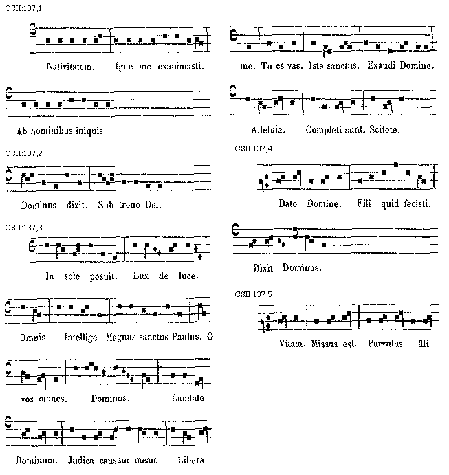 [CSII:137,3; text: In sole posuit. Lux de luce. Omnis. Intellige. Magnus sanctus Paulus. O vos omnes. Dominus. Laudate Dominum. Judica causam meam. Libera me. Tu es vas. Iste sanctus. Exaudi Domine. Alleluia. Completi sunt. Scitote.]