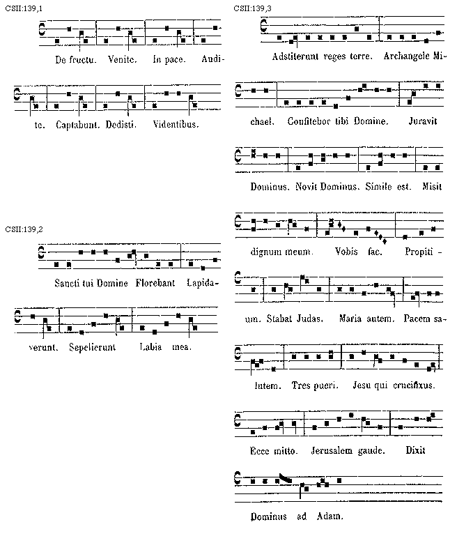 [CSII:139,3; text: Adstiterunt reges terre. Archangele Michael. Confitebor tibi Domine. Juravit Dominus. Novit Dominus. Simile est. Misit dignum meum. Vobis fac. Propitium. Stabat Judas. Maria autem. Pacem salutem. Tres pueri. Jesu qui crucifixus. Ecce mitto. Jerusalem gaude. Dixit Dominus ad Adam.]