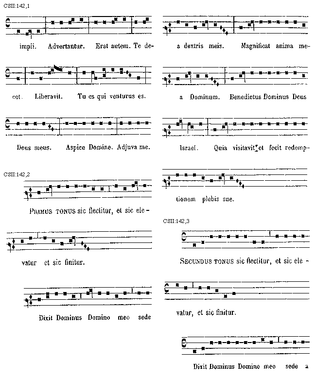 [CSII:142,2; text: Primus tonus sic flectitur, et sic elevatur et sic finitur. Dixit Dominus Domino meo sede a dextris meis. Magnificat anima mea Dominum. Benedictus Dominus Deus Israel. Quia visitavit et fecit redemptionem plebis sue.]