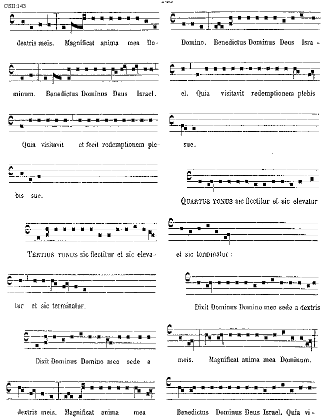 [143][CSII:143; text: dextris meis. Magnificat anima mea Dominum. Benedictus Dominus Deus Israel. Quia visitavit et fecit redemptionem plebis sue. Tertius tonus sic flectitur et sic elevatur et sic terminatur. Quartus tonus sic flectitur et sic elevatur et sic terminatur: Dixit Dominus Domino meo sede a dextris meis. Magnificat anima mea Domino. Quia visitavit redemptionem plebis sue. ]