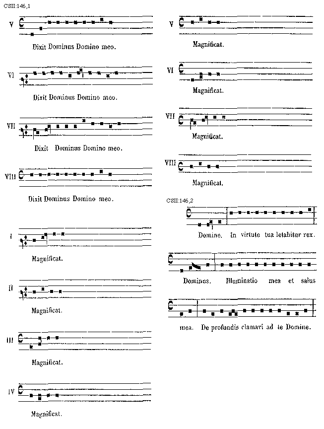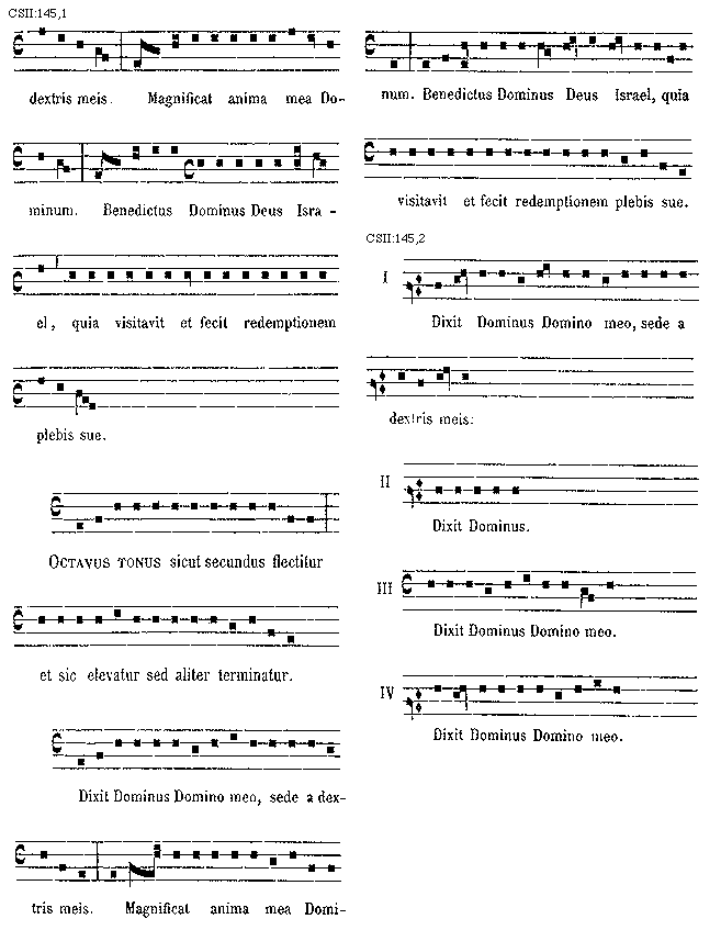 [145][CSII:145,1; text: Magnificat anima mea Dominum. Benedictus Dominus Deus Israel, quia visitavit et fecit redemptionem plebis sue. Octavus tonus sicut secundus flectitur et sic elevatur sed aliter terminatur. Dixit Dominus Domino meo, sede a dextris meis.]