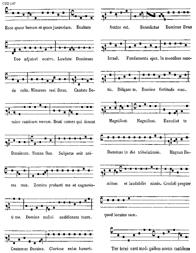 [147][CSII:147; text: Ecce quam bonum et quam jucundum. Exultate Deo adjutori nostro. Laudate Dominum de celis. Miserere mei Deus. Cantate Domino canticum novum. Beati omnes qui timent Dominum. Nonne Deo. Subjecta erit anima mea. Domine probasti me et cognovisti me. Domine audivi auditionem tuam. Cantemus Domino. Gloriose enim honorificatus est. Benedictus Dominus Deus Israel. Fundamenta ejus. In montibus sanctis. Diligam te. Domine fortitudo mea. Magnificat. Exaudiat te Dominus in die tribulationis. Magnus Dominus et laudabilis nimis. Credidi propter quod locutus sum. Ter terni sunt modi quibus omnis cantilena]
