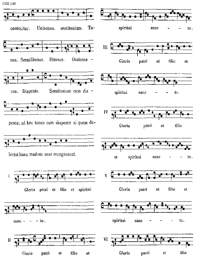 [148][CSII:148; text: contexitur. Unisonus. semitonium. Tonus. Semiditonus. Ditonus. Diatessaron. Diapente. Semitonium cum diapente; ad hec tonus cum diapente si quem delectat hunc modum sese recognoscat. I, II, III, IV, V, VI, Gloria patri et filio et spiritui sancto.]