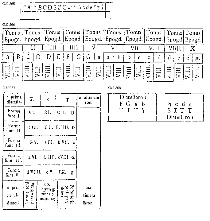 [GSI:267; text: a prima in ultimam diatessaron, T. S, Forma sunt I. Forma sunt II. Forma sunt III. Forma sunt IIII. Forma sunt V. I. II. III. IIII. V. VI. VII. VIII. VIIII. X. A, B, C, D, E, F. G, a, b, c, [sqb], d, e, f, g. a prima in ultimam diatessaron, Prioris toni pars ultima, Semitonium circum diatessaron, Posterioris toni pars ultima.]
