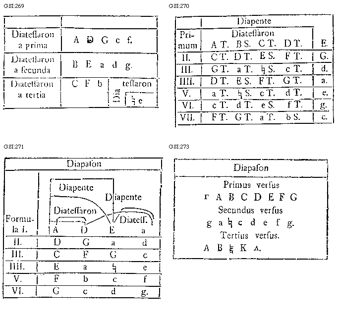 [271][GSI:271; text: Diapason, Diapente, Diatessaron, Formula I. II. III. IIII. V. VI. G, A, C, D, E, F, a, b, c, d, e, f, [sqb], g.]